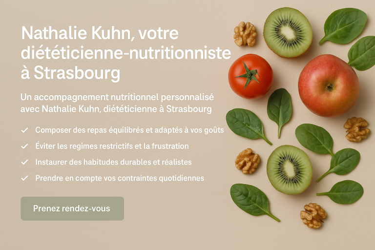 Nathalie Kuhn, diététicienne à Strasbourg, vous accompagne avec bienveillance dans votre rééquilibrage alimentaire. Bilan nutritionnel, suivi personnalisé et conseils adaptés à vos objectifs santé.